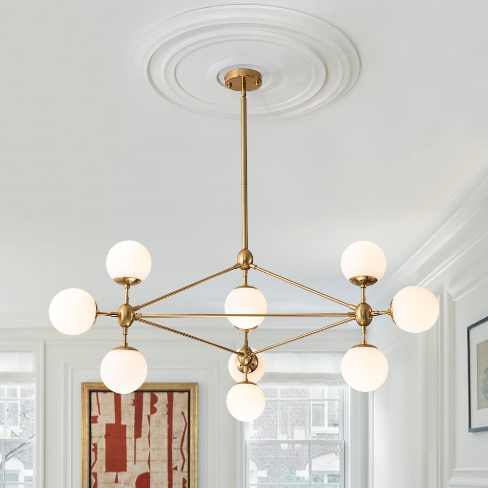 Approach your space with the unique 10-light milky frosted glass globe chandelier! It features a striking stereochemical frame adorned with frosted glass globes on each node, evoking an image of the Molecule and rounding out the design of this decorative chandelier. It features sleek brass or low-profile black finish, along with down-rods to adjust the height to add a touch of understated elegance to any room. This breathtaking chandelier is adept at bringing a touch of sophistication and artistry to your living room, bedroom, kitchen, dining room, entry, or porch.
