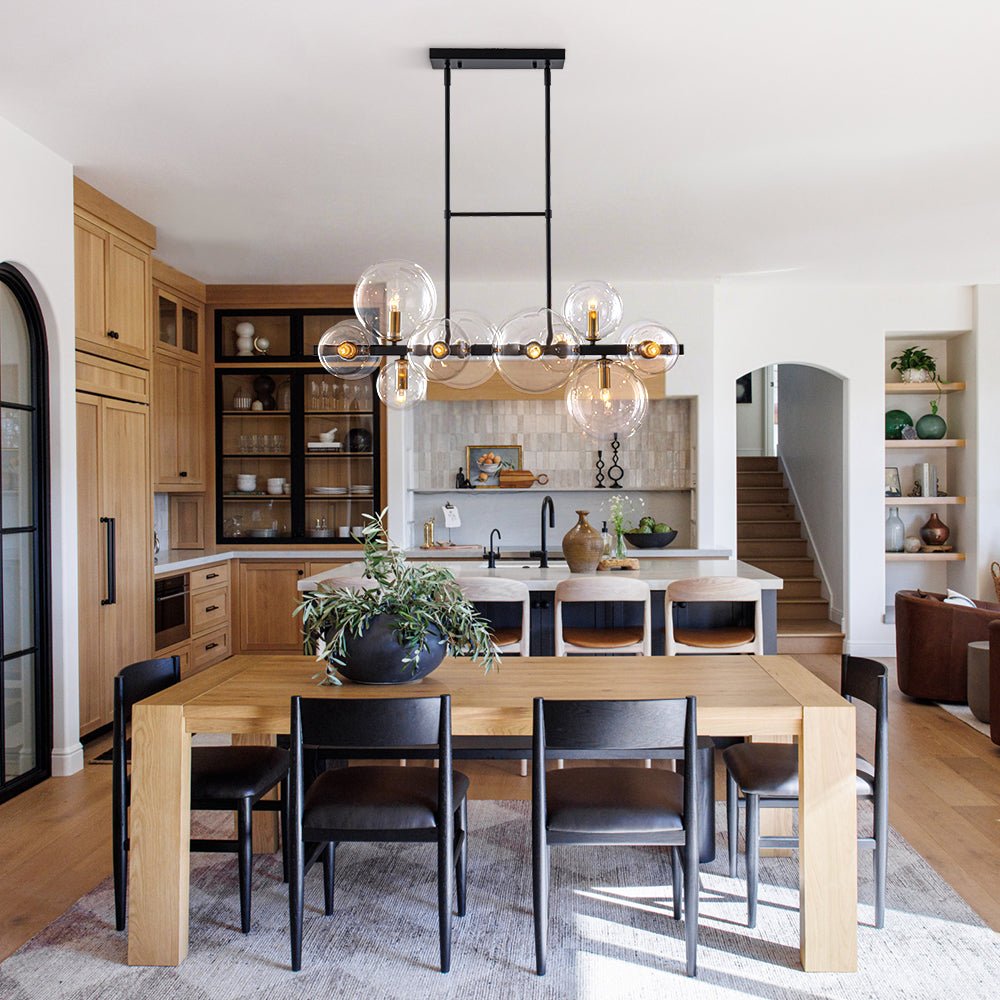Boldly sculptural yet gracefully airy, this modern 12-light stacked glass globe linear chandelier brings architectural elegance to any contemporary space. Featuring a matte black frame accented with warm brass sockets, the design balances sleek industrial style with a refined modern edge. Twelve clear glass globes's arranged in three varied sizes - are thoughtfully staggered to create dimension and movement, making this piece a striking centerpiece above a dining table, kitchen island, or long hallway. The modern linear silhouette offers clean lines while the globe layering adds a touch of playful asymmetry. Whether you're styling a minimalist loft, a modern farmhouse kitchen, or a gallery-inspired living space, this chandelier delivers both luminous function and sculptural form with confident sophistication.