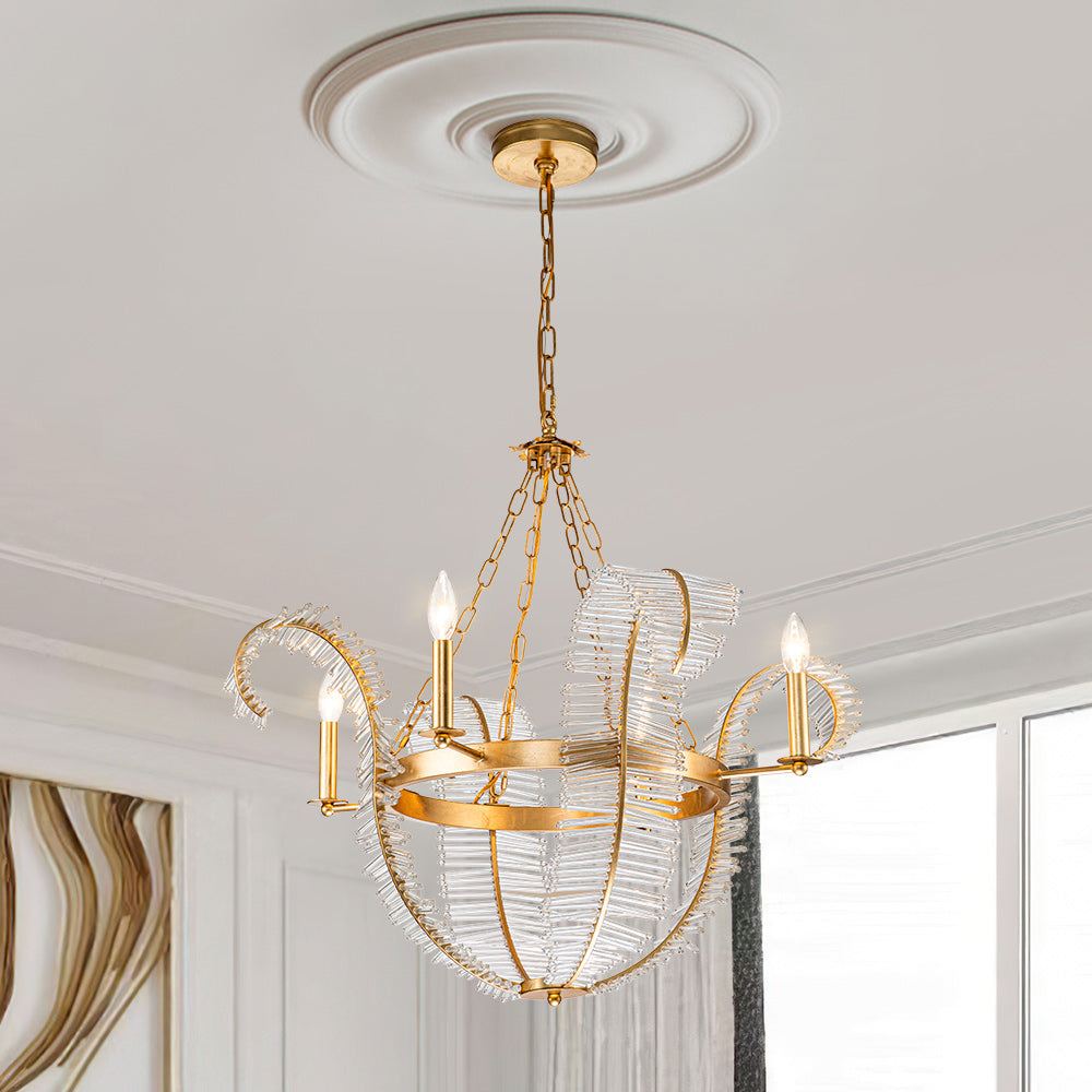 Combining mid-century and trendy yet vintage elements, such a 4-light mid-century decorative candle chandelier leads the way! Extending from a round canopy, at the end of an adjustable chain hangs the well-known wheel chandelier, showcasing a retro vibe while adding a touch of mid-century sophistication. What is especially remarkable is that the circle frame of the decorative chandelier arranges the crystal glass of lily petals as its lampshade, making you feel as if spring is coming because the flower is blooming. The exquisite gold leaf finish of the 4-light mid-century decorative candle chandelier brings the charm of this 4-light chandelier to the extreme, perfect for creating the desired atmosphere in your living room, dining room, bedroom, or entrance.
