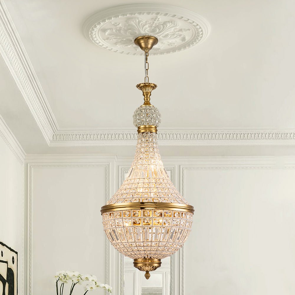 Inspired by vintage French fixtures, this gorgeous crystal luxury empire pendant chandelier shines in any space. Crafted from antique brass structure, this empire chandelier shapes as a gourd structure wrapped by tinny beads and embedded in two different shapes of faceted crystals that catch the light for a dazzling display. With its adjustable chain, this empire pendant is suitable for creating romance at home in a formal dining room or foyer or adding a glamorous touch to a dressing room, master bath, or kitchen island. The crystal luxury empire pendant chandelier casts light with a romantic ambiance, no matter what E12 or E14 bulbs you select.