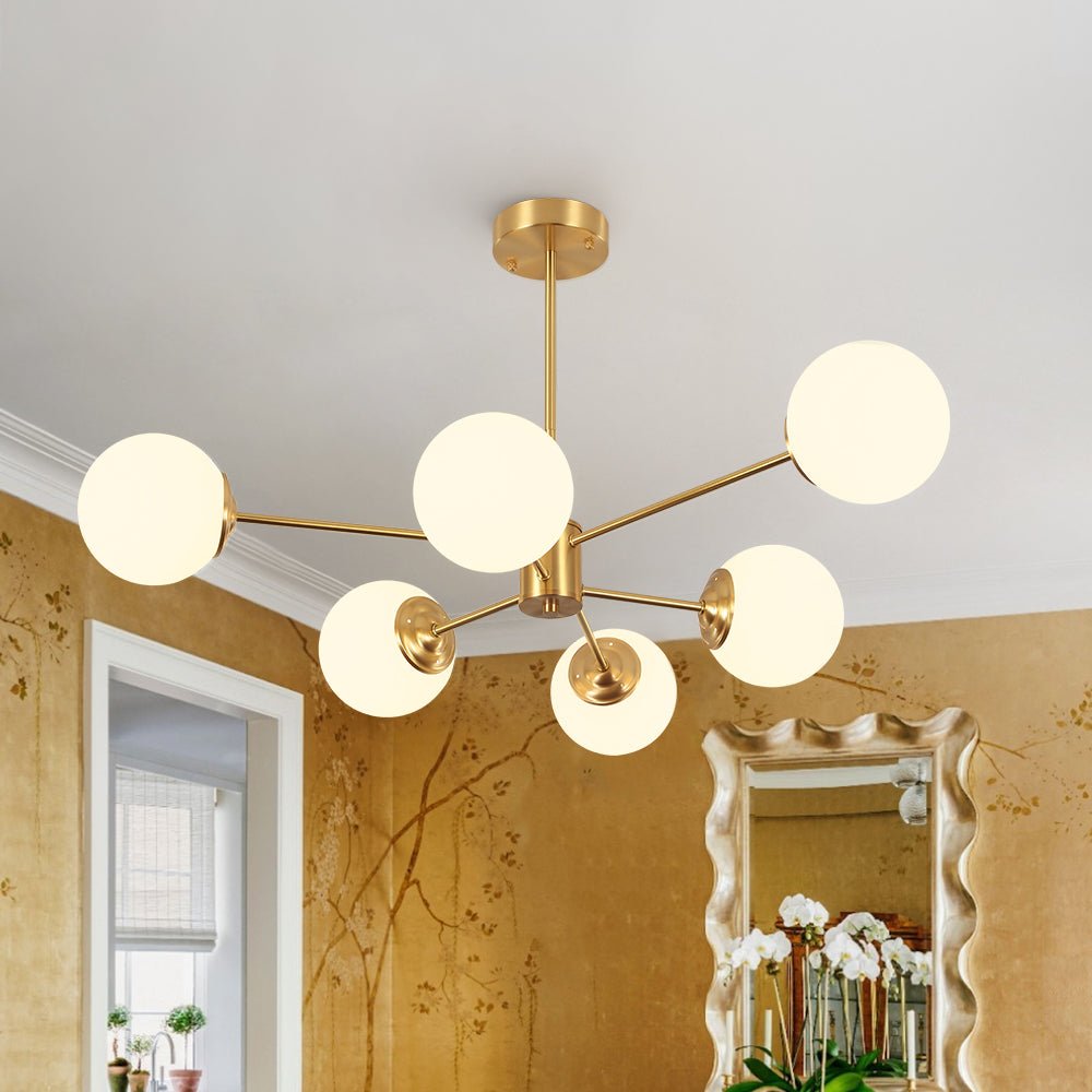 Elevate your space with the timeless elegance of the mid-century brass Modern tiered sputnik glass globe chandelier. A striking fusion of classic design and contemporary flair, this chandelier features a radiant array of matte white glass globes that gently cascade in a tiered arrangement, creating a dynamic visual impact. Available in both 6-light and 8-light options, it bathes any room in warm, inviting light, while its bold brass finish adds a touch of vintage sophistication. The clean lines and sculptural form of the Sputnik design bring a sense of movement and modern luxury, making it an ideal centerpiece for dining rooms, living areas, or entryways. Whether you’re illuminating a cozy space or making a grand statement, this chandelier promises to enhance your home with its distinctive charm and luminous brilliance. Perfect for those who appreciate the beauty of mid-century design, reimagined for the modern era.