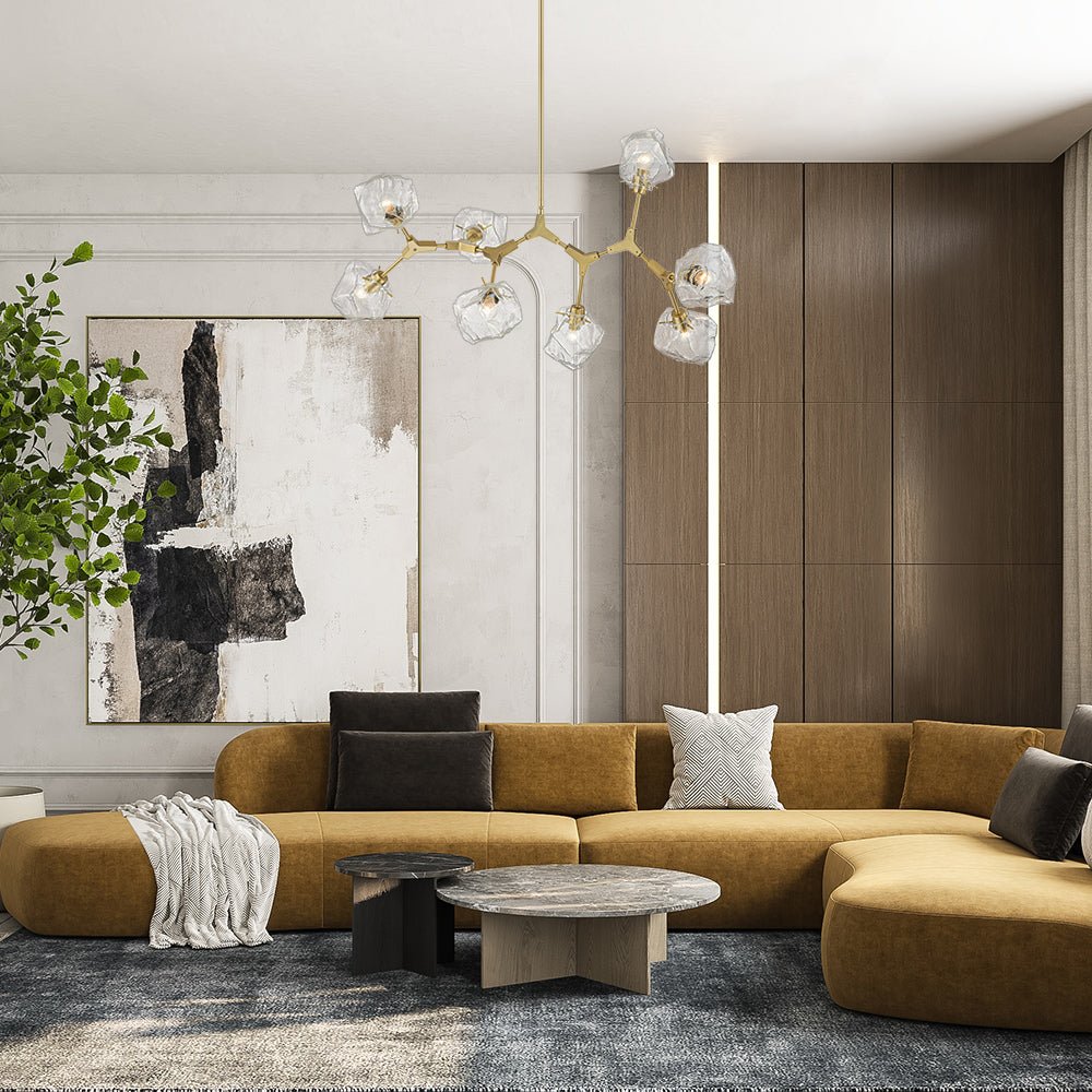 Ice Glass • Branch Linear Form • 8-Light Sockets • Brass Finish • Metal Base • Assembly Required