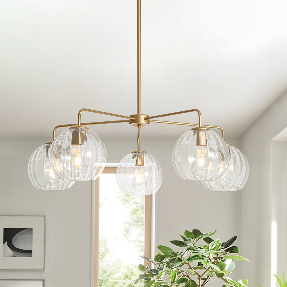 Clean lines meet artisanal craftsmanship in this modern 5-light clear hand-blown glass chandelier, a timeless fixture that brings effortless sophistication to your home. Featuring a painted brass finish and a perfectly symmetrical silhouette, its five ribbed or hammered glass globes offer a delicate balance of elegance and modern design. Each shade can be mounted upward or downward, artfully allowing you to tailor the look and light direction to your preference. The height-adjustable rod adapts to ceilings of varying heights, making it versatile for dining rooms, living areas, or kitchens. Fully dimmable, this chandelier transitions seamlessly from bright and functional to warm and inviting, enhancing both contemporary and transitional interiors with refined charm.