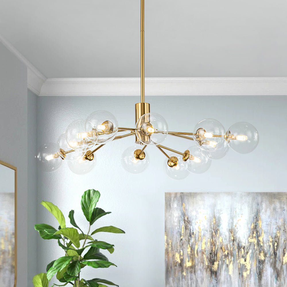 Radiantly light up your space with this magnificent glass bubble Sputnik chandelier! Four, five or six metal branches evenly inserted in the central column lamp housing, subtly create a stylish yet chic sputnik look and offer a stunning statement to any room. Three clear glass globes adorned each arm, like soap bubbles rising over the bath, evoking a romantic fancy of showering in a forest. This beautiful molecule chandelier is encased in dazzling twelve, fifteen or eighteen clear glass spheres that reflect and refract light, creating a stunning galactic effect to greatly impress your guests. It's an exquisite addition to residential areas like living rooms, dining rooms, bedrooms, entrances, or commercial places.