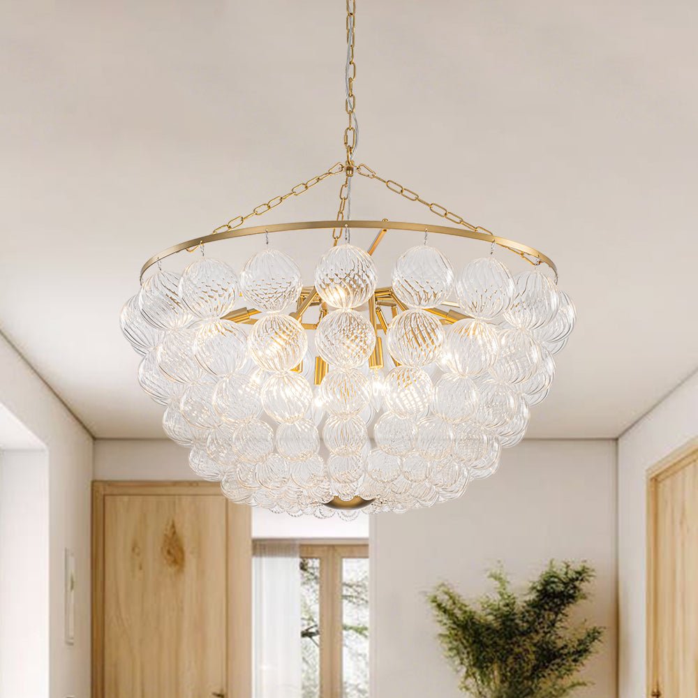 Graceful, luminous, and artfully detailed, this glam swirled glass globe string bowl chandelier transforms any space with its unparalleled lighting effect. Featuring a cascading arrangement of hand-swirled glass globes, the design evokes a radiant sense of movement and texture, beautifully balanced by a brushed brass frame. Available in both 6-light and 12-light options, this chandelier adapts effortlessly to intimate dining rooms or grand living areas, offering versatile illumination for every occasion. The dimmable function lets you create the perfect atmosphere, from vibrant brilliance to a soft, romantic glow. Whether styled in contemporary, modern glam, or luxe-inspired interiors, this chandelier becomes a breathtaking focal point—marrying timeless craftsmanship with elevated sophistication.