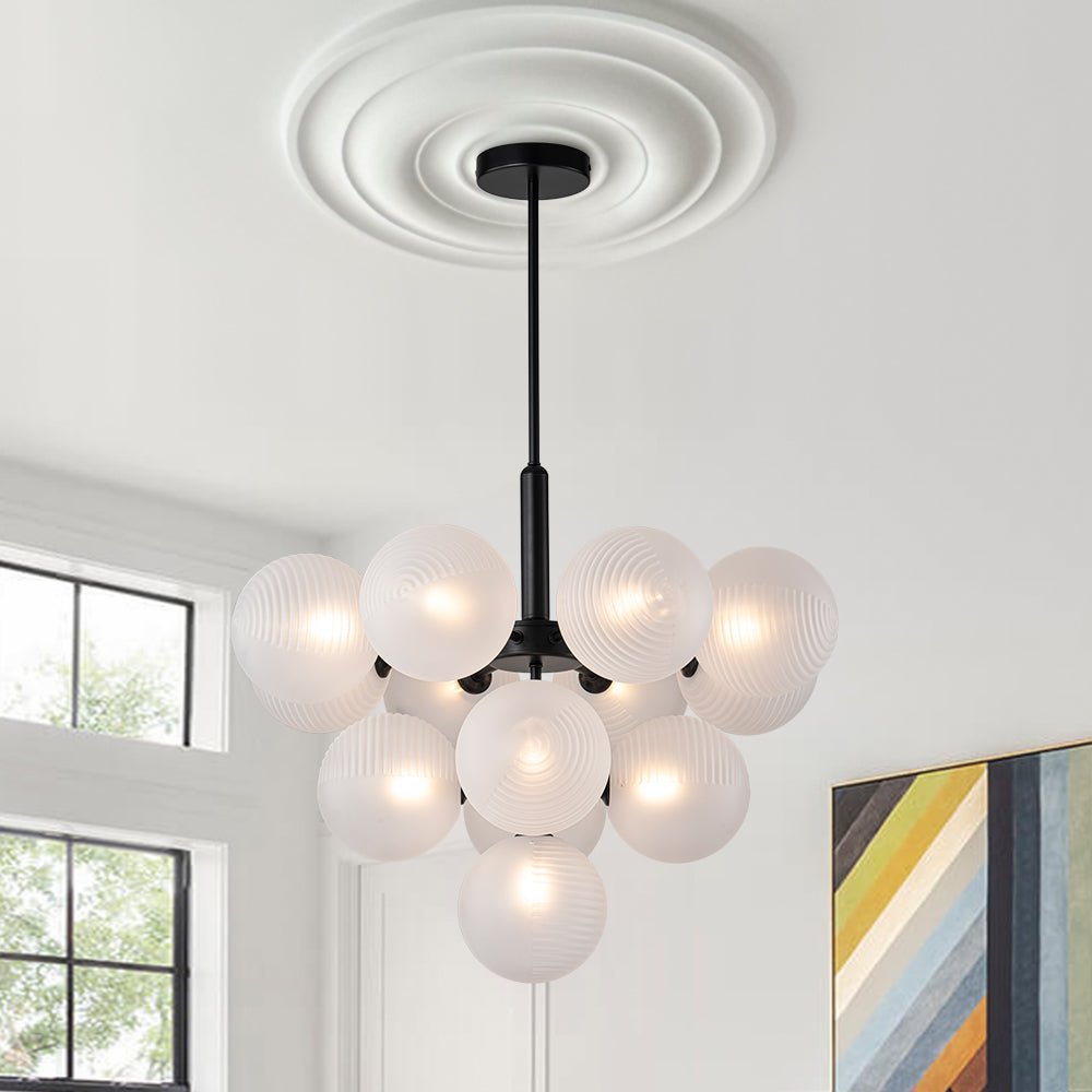 Decorative bubble cluster grape chandelier is a light and airy group of glass balls suspended from a round canopy. Such a decorative cluster chandelier features a 5-light or 13-light model with a sleek gold finish and a beautiful touch of opal glass. The grape chandelier is outfitted in two sorts of glass, fixed on the central metallic lamp frame for a lovely grape outlook. These glass hemispheres were inspired by satellite orbit, designed as a texture of ripples of water in circles. Rich in devising details, maximize the elegance of this gorgeous modern bubble chandelier. You can enjoy its lighting in your spaces, such as the dining room, bedroom, living room, and even your bathroom. It will be one of the centerpieces of your interiors.