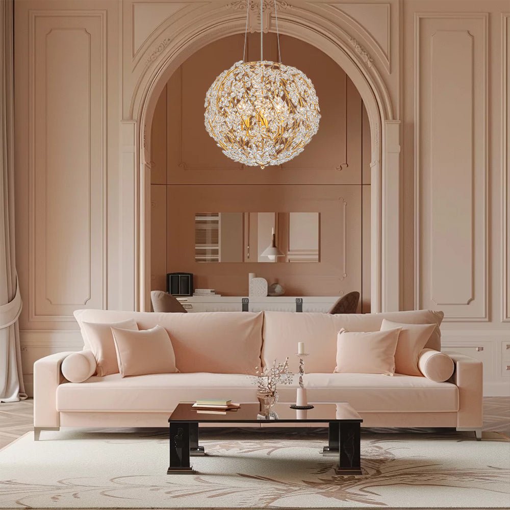 Let the glam luxury crystal vines chandelier rewrite your ceiling's constellations - its spherical silhouette blooms like a frozen garden, where hand-twisted crystal vines clasp luminous orbs in a floral embrace. Choose 6-light elegance for intimate soirées, or 8-light grandeur to crown vaulted spaces with diamond-dusted drama. Each prismatic tendril breathes Baroque romance into modernity: sunlight fractures into rainbow fractals at dawn, while evenings transform crystal petals into flickering firefly choruses. The wrought-iron framework wears its gilded age proudly, cradling glass blossoms that scatter light like shattered stardust across walls, which perfectly decorate your living room, entryway, bedroom, or nursery room.