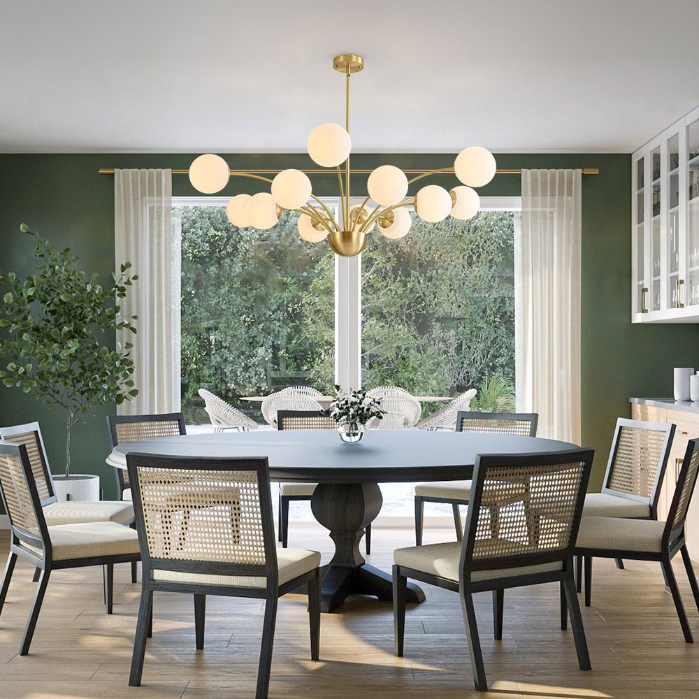Ignite your space with the dazzling brilliance of the mid-century 12-light firework-blooming frosted glass globe chandelier. Reminiscent of a blooming firework frozen in time, this show-stopping fixture boasts a burst of frosted glass globes radiating from a solid brass core. Each globe diffuses a soft, enchanting glow, while the gleaming brass finish exudes timeless sophistication. A true centerpiece of decorative artistry, this chandelier blends mid-century charm with modern elegance, transforming any living room, dining area, or foyer into a gallery of light. Perfect for those who crave a bold yet refined statement piece, this chandelier sparks conversation and illuminates with style.