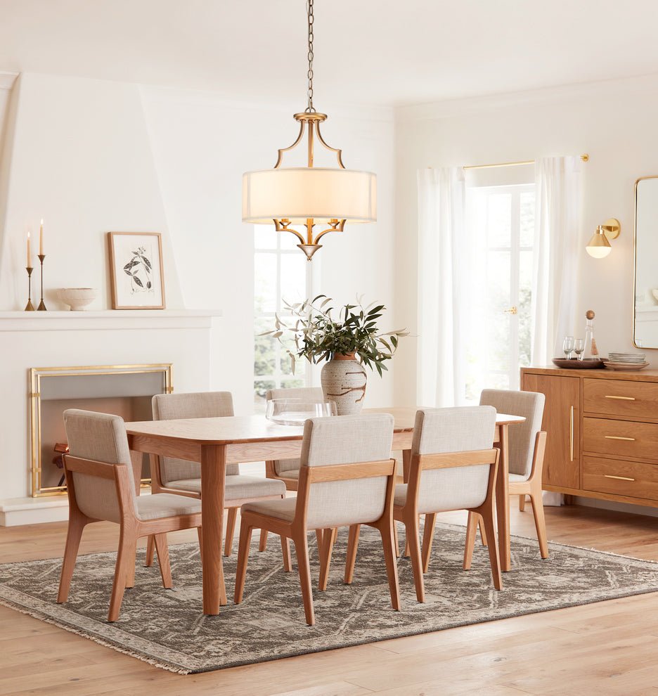 Designed in a gold metal finish that matches perfectly with the white fabric shade, the hanging drum chandelier emits a sparkling soft light into your space! Featuring three curved metal loops and lamp-holders holding E12 candelabra base 40-Watt bulbs (sold separately), this mid-century chandelier decorates your space without effort. The 3-light hanging drum chandelier carries a height-adjustable chain, pairing with an off-white drum shade, creating a warm ambiance for a dining room, kitchen island, foyer, living room, entrance, hallway, or stairwell