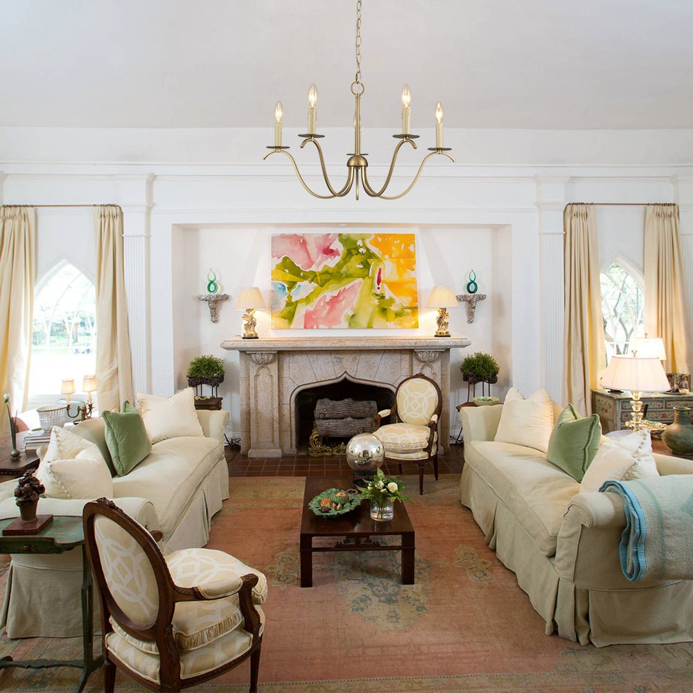 Dance into mid-century elegance with the 5-light candle-style swooping arm chandelier. This exquisite piece, finished in brushed brass, features an octopus silhouette with gracefully swooping arms that evoke a sense of underwater whimsy. Each arm, adorned with candle-style lights, casts a warm, dimmable glow, allowing you to set the perfect ambiance for any occasion. Height-adjustable, this chandelier adapts effortlessly to your space, making it a versatile addition to any room. Whether illuminating a dining area or adding drama to a living room, this stunning chandelier is a poetic blend of form and function. Let it be the star of your home, weaving tales of timeless beauty and modern charm with every flicker of light.