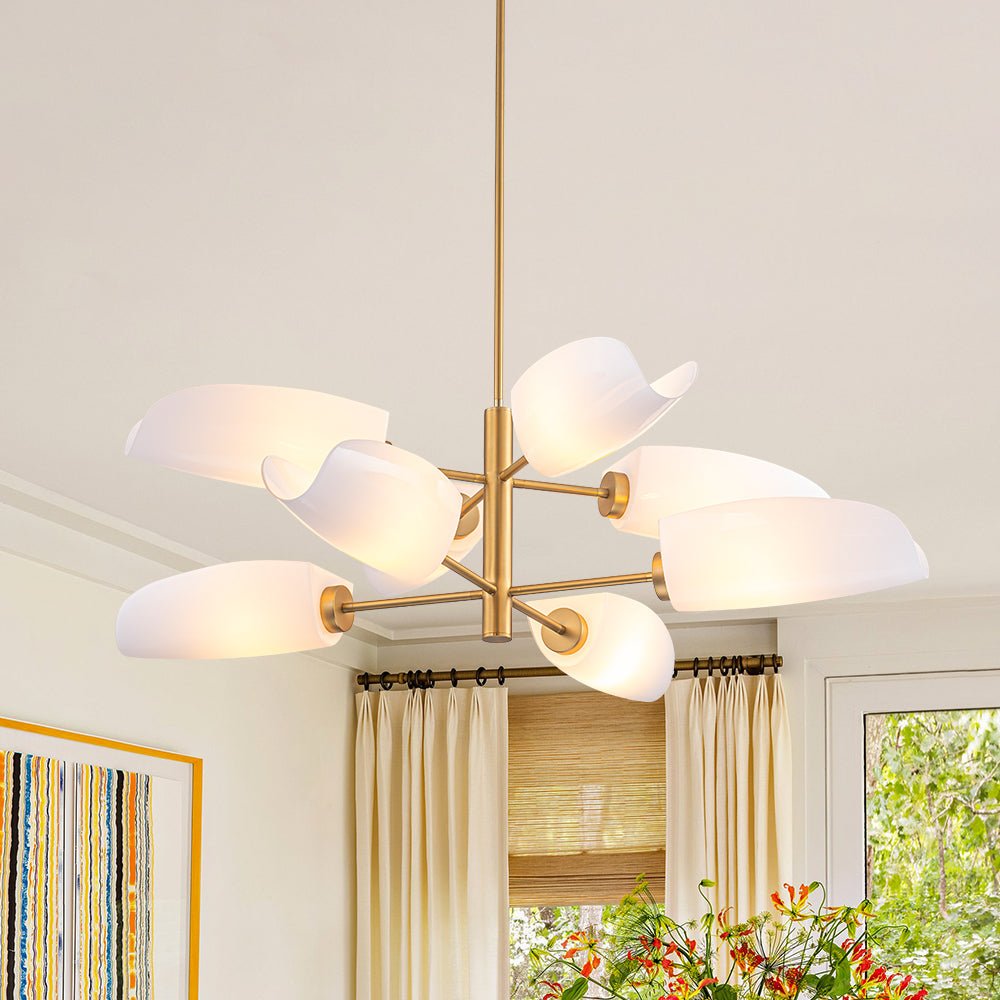 Graceful yet striking, this mid-century 8-light glossy leaf glass Sputnik chandelier reimagines organic beauty in a modern form. Its leaf-like opal glass shades bloom effortlessly from a central stem, radiating light with a soft, inviting glow. Arranged in a dynamic 2-tier branch design, the stunning chandelier creates depth and dimension, while its modular form allows for changeable outlooks to suit different spaces and moods. Perfect above a contemporary dining table, in a refined living room, or as a statement in an airy entryway, it merges natural inspiration with architectural precision. The glossy opal glass paired with warm metallic accents brings mid-century charm to modern interiors, offering both functional illumination and sculptural artistry.