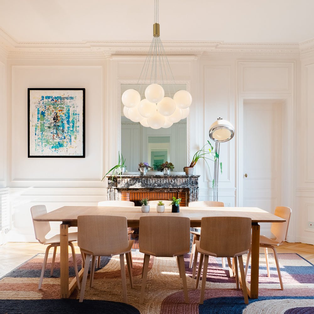A stunning lighting solution combines contemporary design and timeless elegance - the modern 13-light cluster opaline glass bubble chandelier. Featuring 13 opaline glass globes, the dreamy bubble chandelier is clustered together, each emitting a soft, diffused glow that enhances the ambiance of any room. The sleek brass finish adds a touch of sophistication, while the bubble-like design brings a playful yet refined charm. Perfect for dining rooms, living areas, bedrooms, bathrooms, or entryways, this chandelier provides ample light and becomes a stunning focal point.