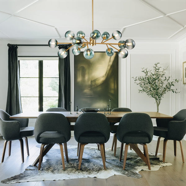 Showcasing a striking silhouette sparked by the space race, our 15-light opal glass sputnik sphere chandelier brings a splash of modern style as it illuminates any arrangement. This stunning chandelier features 15 opal glass globes that radiate from a central column, creating a branch silhouette that resembles a Sputnik look. The modern chandelier is available in gold or black finish, adding option and elegance to the design. It requires 15 G9 base bulbs (not included) to create task lighting and a gorgeous ambiance. Whether you hang it over your dining table, living room, or bedroom, this chandelier will make a statement and enhance your decor with its unique and stylish look.Quick Access to version with .