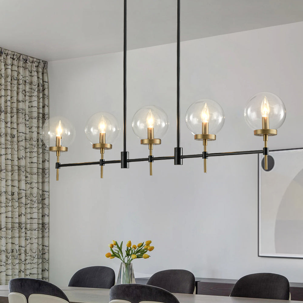 Embrace the avant-garde elegance of the modern 5-light clear glass linear chandelier, a masterpiece for your space. This design triumphs fearlessly marries two-toned metals, celebrating a harmony of textures in perfect union. Inspired by the timeless allure of mid-century minimalism, it presents a spectacle of blown-glass orbs that seem to float weightlessly, capturing the very essence of light itself. Each orb, meticulously hand-blown, embodies a whisper of craftsmanship, their crystal clarity amplifying the luminosity cast by five brilliant lights. Suspended with a graceful linear form, it carves a striking silhouette against your ceiling, its substantial yet airy presence a testament to the mastery of blending form and function. More than a mere illumination source, this chandelier becomes an artistic declaration in your living space, inviting admiration and sparking conversations!