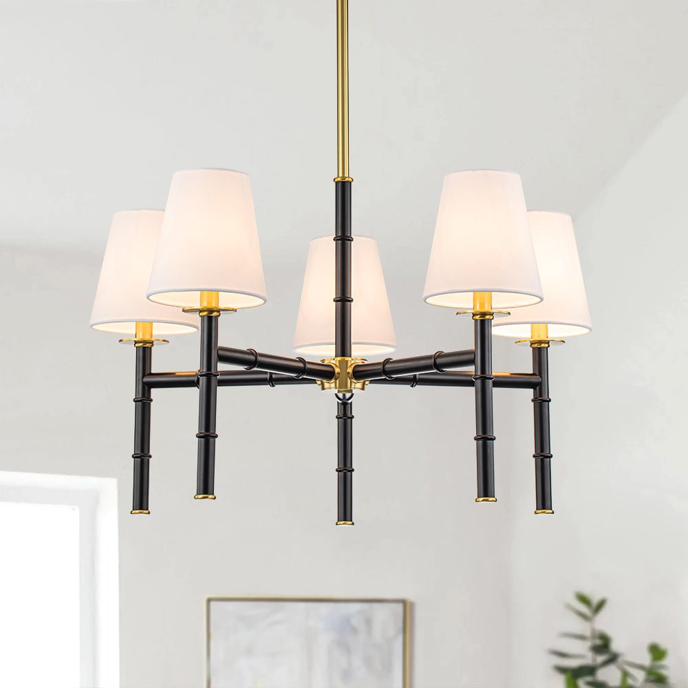 Unbelievably make a statement in your living space with this modern 6-light sculptural cone chandelier. Its captivating design features an array of vertical rods formed into impressive bamboo joints, creating a visually intriguing composition. This decorative chandelier owes tapered linen drum shades gracefully diffusing the light, adding a soft and welcoming glow. Down-rods in brass finish gorgeously contrast with white cone lampshade and black support stems adorned with flat finial, the sculptural chandelier incredibly exudes an air of elegance. Its bright and stylish silhouette will be perfect for any style and add a touch of sophistication that will transform your interiors like the living room, dining room, bedroom, kitchen, entryway, entrance, and staircase.Details