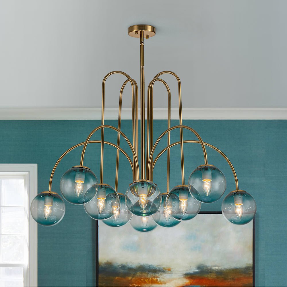 Touch the mesmerizing allure of our modern brass 10-light gradient glass comet chandelier, a celestial masterpiece that adds a touch of cosmic elegance to any space. With gracefully curved arms that evoke the majestic sweep of a sputnik, this glam chandelier embodies the epitome of modern sophistication. Crafted with exquisite attention, the gradient glass shades resemble a blue firework blooming in the night sky, casting a mesmerizing glow that captivates the imagination. More than just a lighting fixture, this chandelier serves as a stunning centerpiece that effortlessly elevates the ambiance of any space and enhances the elegance of your living room, dining area, bedroom, kitchen, entryway, foyer, or even your home office.