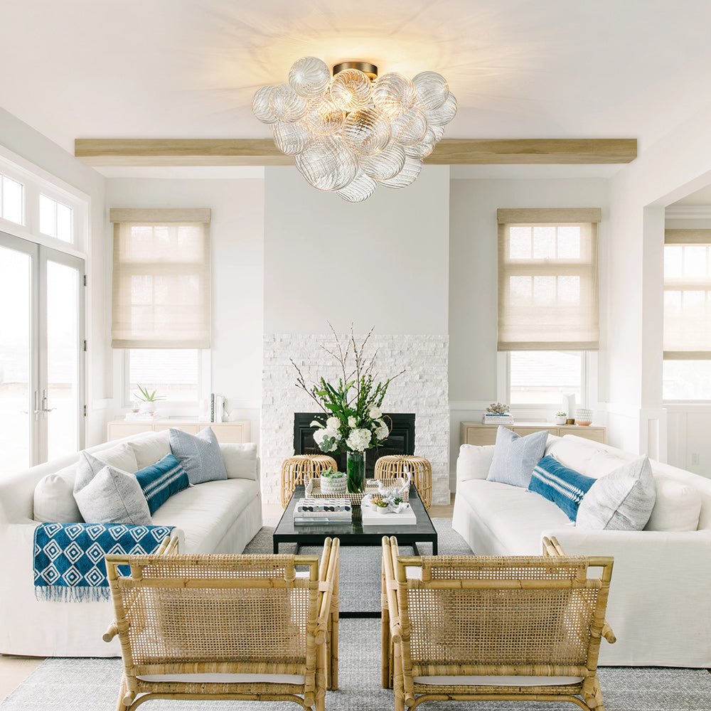 Terrifically elegant and sophisticated, the modern decorative cluster bubble semi-flush mount is bound to emerge as a focal point! Featuring water ripple glass spheres of three sizes, this stunning ceiling light joyfully creates a gorgeous bubble effect, while the modern yet sleek brass finish adds an alluring and refined touch. Its versatile semi-flush mount design allows you to install this graceful fixture on low or high ceilings, making it suitable for all kinds of layouts. Whether you want to illuminate your living room, bedroom, dining room, kitchen, entryway, or hallway, this exquisitely ribbed glass bubble ceiling light will add a stylish and eye-catching element to your decor.