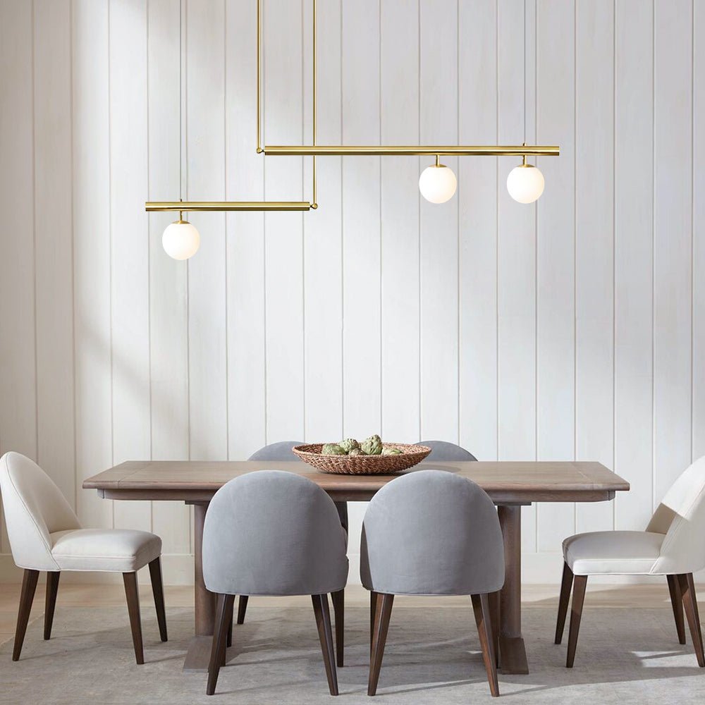 Defined by its simple shape and balanced form, this scandinavian glass globe linear chandelier features five opal globes hanging on two geometric arms, bringing a splash of Scandinavian style and gives your room a timeless sophistication. The elegant glass globe linear chandelier was crafted from metal with a brass finish, utilizing an adjustable cable that can be customized to your desired configuration. Combining aesthetic and functional, the glass globe linear chandelier is the perfect addition to elevate your interior in modern style.